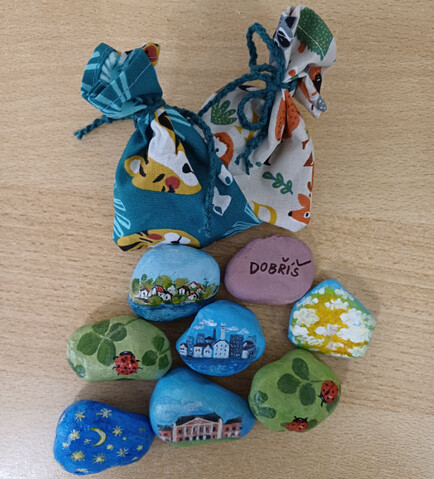 Výrobu zajistila společnost Xaverius s.r.o., sociální podnik zaměstnávající osoby se zdravotním a sociálním znevýhodněním. V jejich dobříšské dílně Rukama Nohama tak vznikly originální náramky v hnědozelených tónech z darovaných korálků a ručně malované kamínky – některé dokonce s motivy našeho města. Tyto drobné upomínkové předměty jsou uloženy v látkových pytlíčcích, které rovněž vznikly v této dílně. Každý pytlíček je ušitý ze zbytků látek, a tím nejen šetří životní prostředí, ale také dává nový smysl materiálům, které by jinak zůstaly nevyužité. Spolupráce s dílnou, která pro město vyráběla také placky se špendlíkem s motivem srdíčka, byla velmi milá – děkujeme!