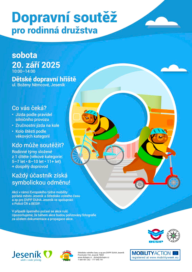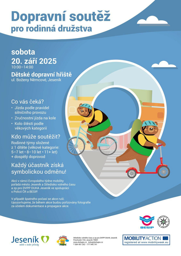 V Jeseníku se hýbe spousta lidí. Maminky s kočárky, malí čertíci na odrážedlech, fotbalisté, jogínky, běžci i cyklisté. Hýbou se ti nejmenší i ti nejstarší. Naše město žije každodenním ruchem a shonem, sportem i poklidnými procházkami po celý rok. A to je skvělé. V září k tomu přidáme ještě něco navíc – společné výzvy, diskuzi o veřejném prostoru i dopravní soutěž pro rodiny.Zatímco zaměstnanci městského úřadu vyrazí Do práce na kole nebo pěšky (8.–19. 9.), děti základních škol se tradičně zapojí do akce Pěšky do školy. Vy si můžete dát svoji vlastní výzvu – projít se na nákup, vyrazit do práce na kole nebo si dopřát podvečerní procházku s rodinou. Každý krok a každá otočka pedálu se počítá pro zdraví, čistší vzduch i přátelštější město.