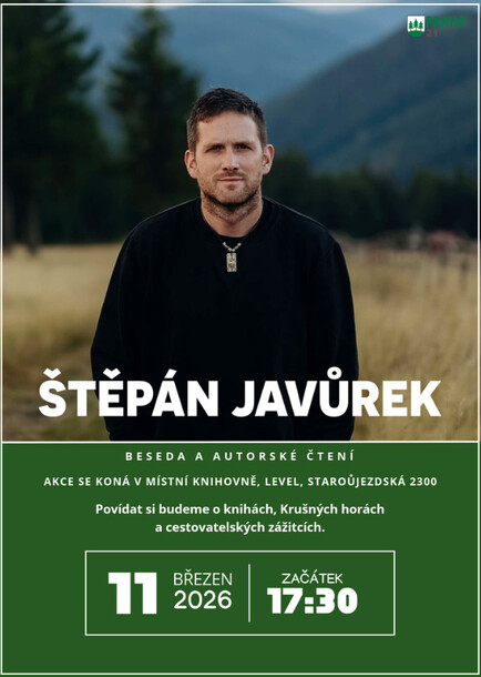 Srdečně zveme všechny čtenáře na besedu a autorské čtení s populárním spisovatelem Štěpánem Javůrkem, autorem trilogie Sudetský dům a knih Nebe nad Perninkem a Chaloupky, která se bude konat ve středu 11. března 2026, od 17.30 hodin v místní knihovně.Těšit se můžete na zajímavé povídání o autorově práci, dozvíte se, kde nachází inspiraci ke svým knihám a proč právě Krušné hory hrají v jeho tvorbě tak významnou roli.
