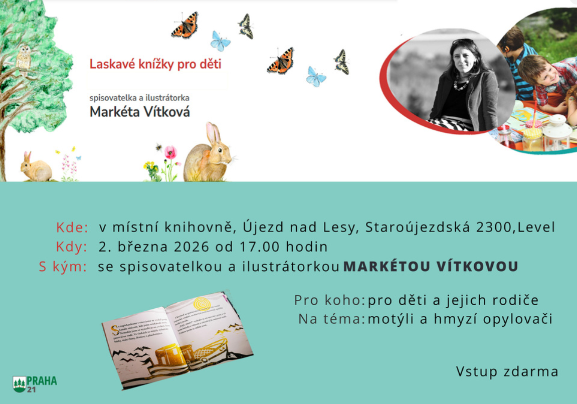 Srdečně zveme mladší děti a jejich rodiče na besedu se spisovatelkou a ilustrátorkou Markétou Vítkovou, která se bude konat v pondělí 2. března 2026 od 17. hodin v místní knihovně. Přijďte si popovídat o tom, jak se z housenky stane krásný motýl, poznat čmeláky, brouky, mouchy a další hmyzáky. Dozvíte se také spoustu zajímavostí ze života včel, poznáte důležitý proces opylování, bez kterého by se na rostlinách netvořily plody, které tak rádi jíme.Markéta Vítková se ve svých knihách zaměřuje na nejmenší a začínající čtenáře, většinu knih si sama různými technikami ilustruje. Má ráda přírodu, cestování a svět dětské fantazie, což se vše odráží v jejích knihách. Vstup volný. Těšíme se na vás