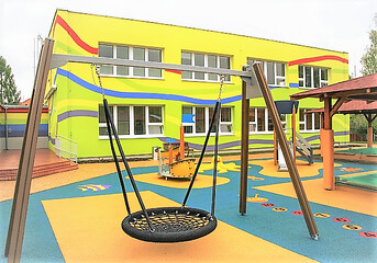 Barevná fasáda, velký model chobotnice uprostřed hřiště, dřevěné prolézačky v nedalekém lesíku...